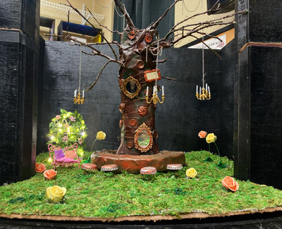 I was tasked to choose two scenes from the play to design sets for. I ended up going with the second scene and the epilogue. The scenes themselves were not described with much detail in the script, but from the text I was able to gather that the second scene took place in a sort of aristocratic common space, and the epilogue took place in a dark part of the forest. I decided to take inspiration from the Tinker Bell movies for the second scene, leaning into a sort of "lost things" look for the tree. I wanted it to be unclear to the viewer whether the tree was something created by the butterflies, or just a tree that they decorated. I carried this theme into the bottle cap barstools. I also wanted to reflect the vain and luxurious qualities of the butterflies in the set. I put several mirrors on the tree with the idea that the butterflies could primp while they chat at the bar. I also took inspiration from my aunt's backyard and added chandeliers hanging from the branches of the tree. I've always loved the idea of outdoor chandeliers, and I think it adds a sort of superfluous flair to the scene that the characters really seem to embody.